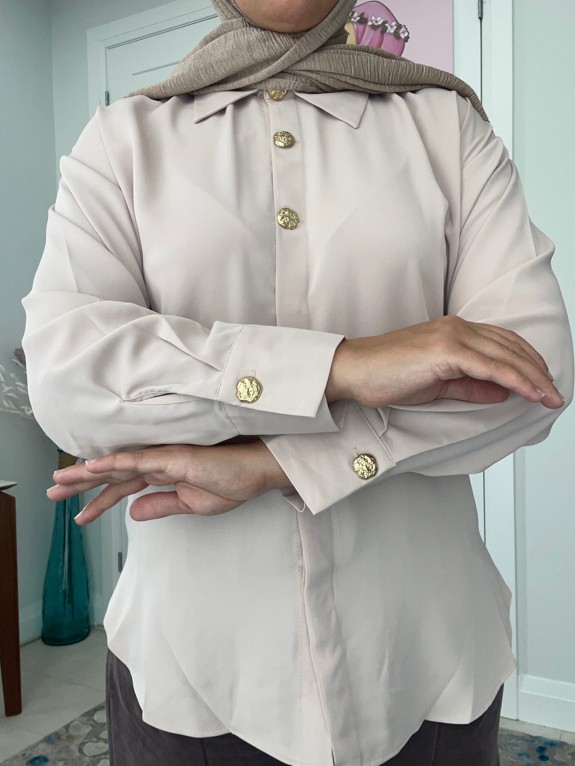 Elevate your everyday style with the Golden Elegance Shirt, designed from a lightweight and flowy fabric that ensures comfort all day long. Featuring chic golden buttons for a touch of luxury and classic long sleeves with a refined collar, it’s the perfect blend of modesty and modern elegance. Style it effortlessly with wide-leg pants or skirts for a polished look. A wardrobe essential for both office wear and casual chic outfits…
