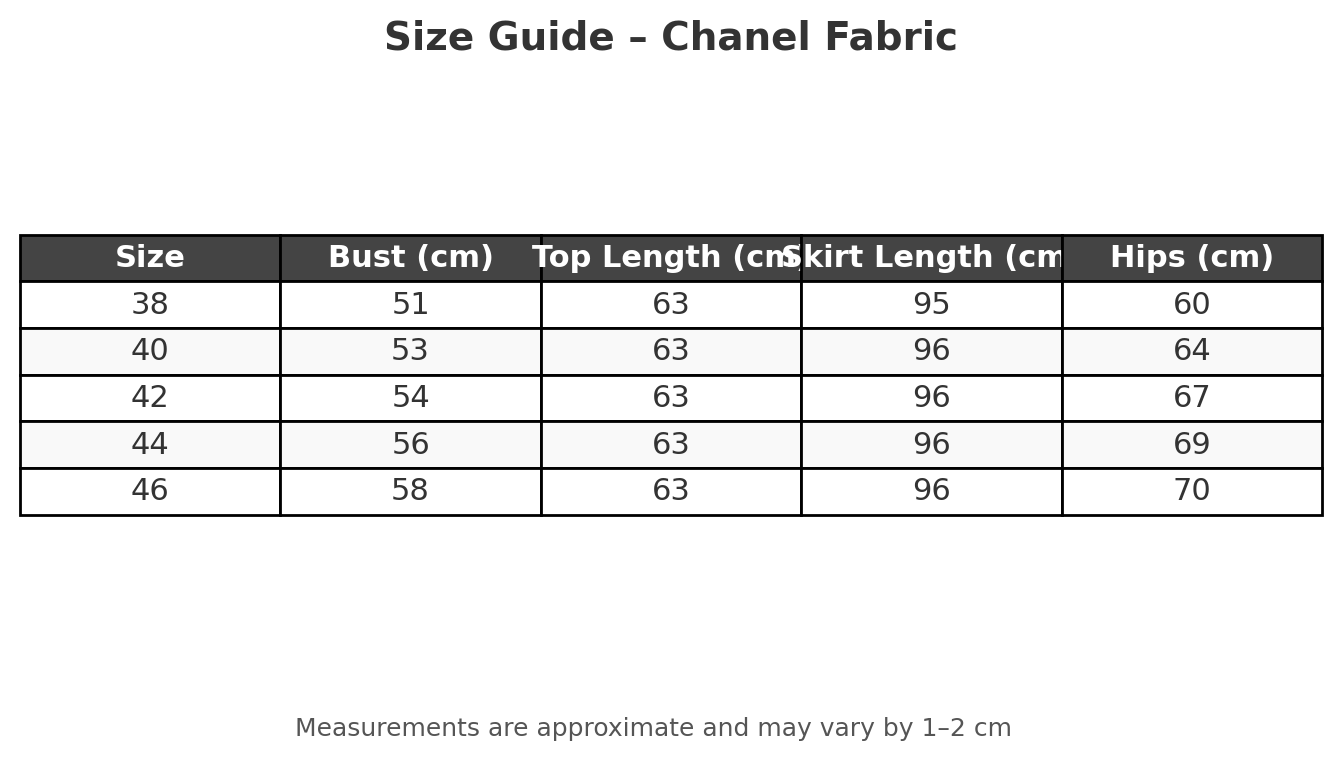 - Fabric: Chanel (Parisian tweed-inspired)